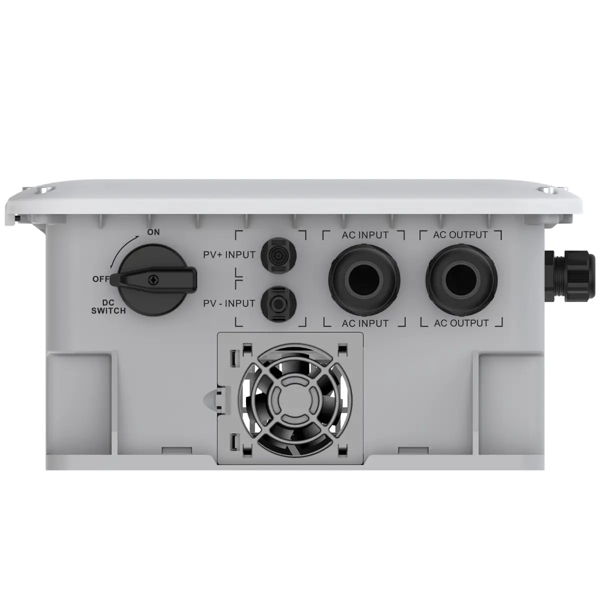 Este modelo tiene la capacidad de funcionamiento híbrido (permite entrada de paneles solares + CA al mismo tiempo) y puede converger las dos fuentes para dar mayor potencia a la salida. Por ejemplo, cuando detecta que la luz solar es insuficiente, agrega parte de potencia desde la fuente CA para mantener el rendimiento, logrando un funcionamiento totalmente automático sin la necesidad de conmutación.