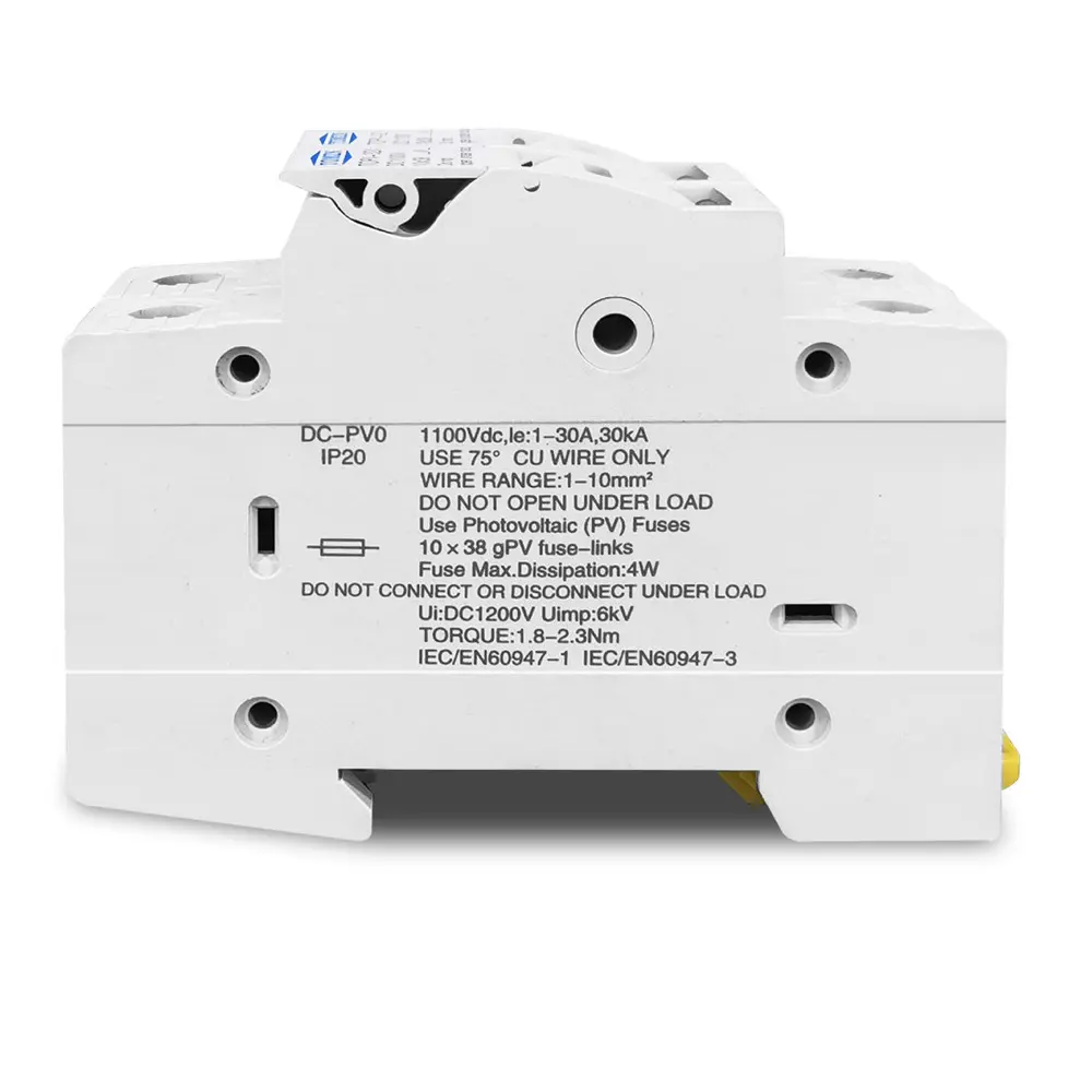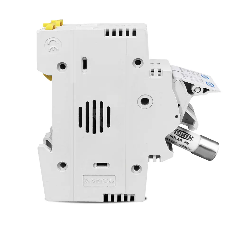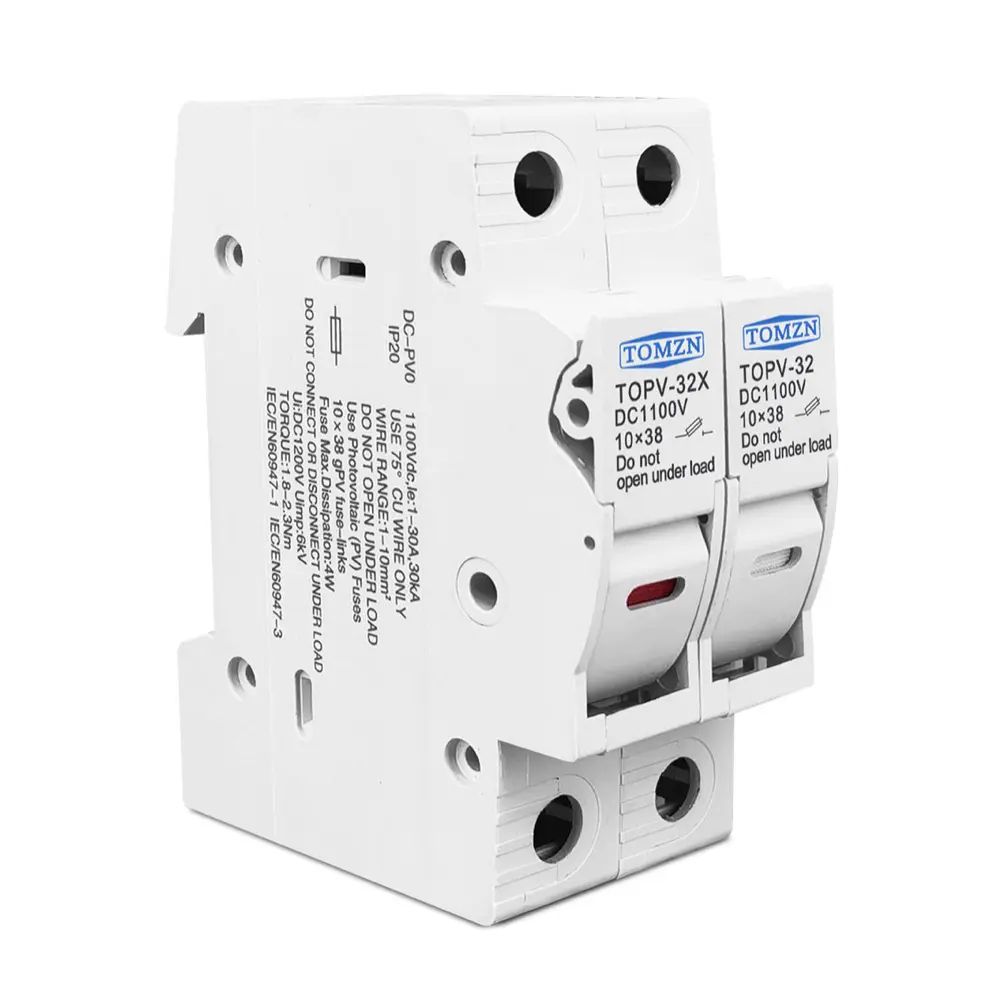 - Compatible con 2 fusibles 10×38 mm: acepta hasta dos fusibles solares gPV estándares (de 1 A hasta 32 A), brindando protección versátil para distintos tamaños de cadenas fotovoltaicas.