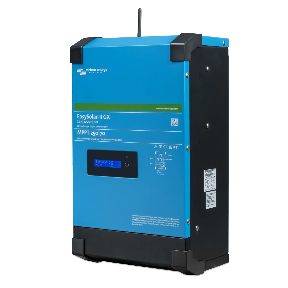 El EasySolar-II GX combina un controlador de carga solar MPPT, un inversor/cargador y un centro de control en una misma carcasa. El producto se instala fácilmente, con un mínimo de cableado.