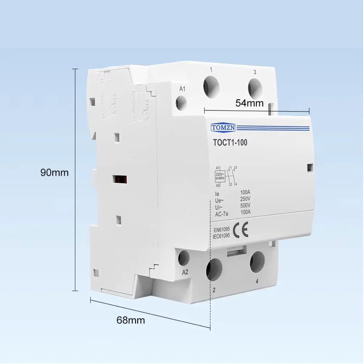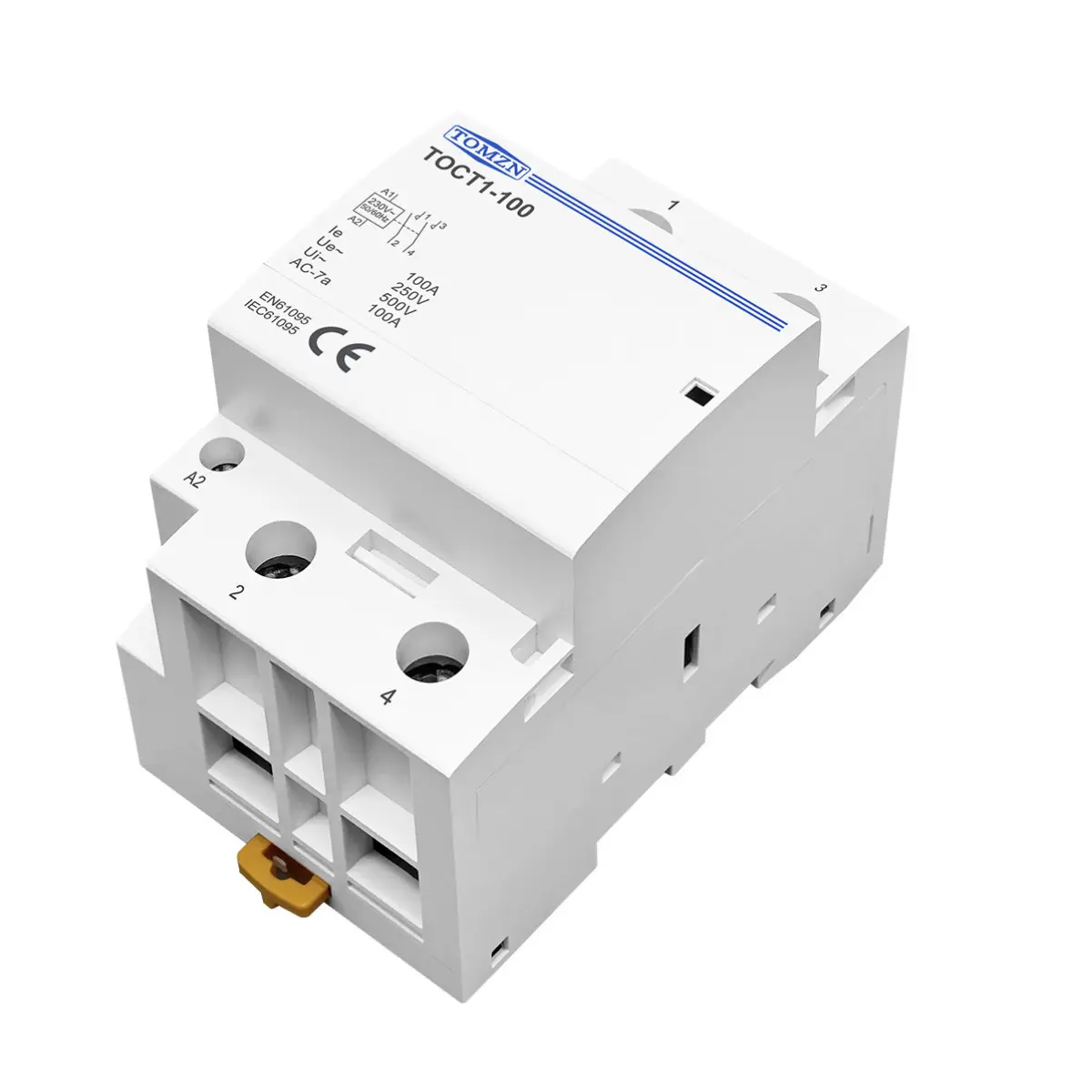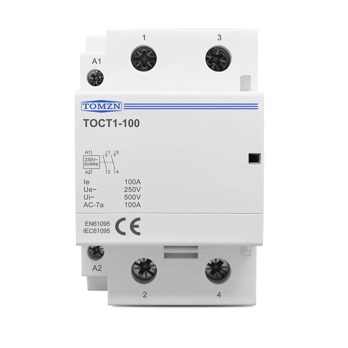 La serie TOCT1 de TOMZN ofrece variantes de 2 polos (2P) y 4 polos (4P) con corrientes nominales de 63 A hasta 100 A, adecuadas para controlar desde circuitos monofásicos de alta demanda hasta cargas trifásicas moderadas.