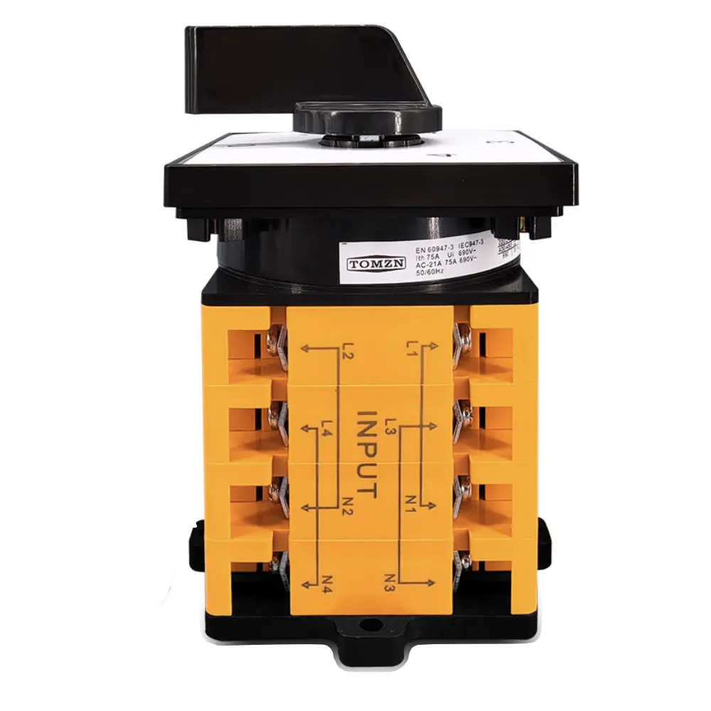 Conmutador manual TOMZN – 4 fuentes / 1 salida, 75 A, 230 Vca monofásico (2 polos), 50/60 Hz.