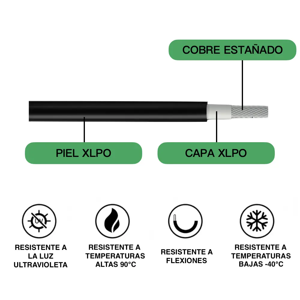 Aunque otros cables de cobre o aluminio pueden transportar energía, no están diseñados para resistir la intemperie, radiación solar y esfuerzos térmicos. Esto reduce drásticamente su vida útil, expone tu sistema a fallos eléctricos, pérdidas de rendimiento o riesgos de incendio.