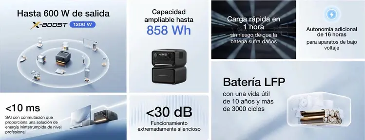 Su salida AC de 600 W con onda sinusoidal pura permite alimentar desde notebooks y herramientas livianas hasta pequeños electrodomésticos. Además, la tecnología X-Boost eleva su capacidad de uso hasta 1200 W (según el tipo de carga), ampliando considerablemente sus aplicaciones reales en situaciones exigentes. Las múltiples salidas —USB-A, USB-C de 100 W, DC de 126 W y 3 tomas de CA— posibilitan la carga simultánea de diversos dispositivos con excelente eficiencia.