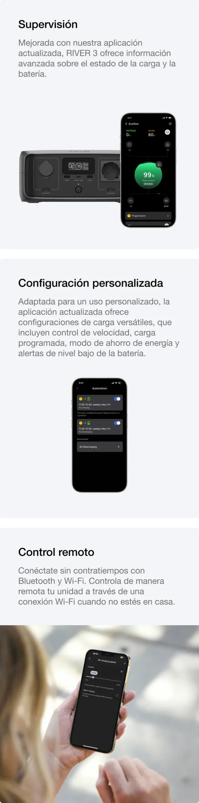 La RIVER 3 (UPS) puede recargarse desde la red eléctrica (hasta 305 W), desde paneles solares de hasta 110 W o mediante el encendedor del coche. Su pantalla frontal muestra de forma clara el estado de la batería, los tiempos estimados y la potencia de entrada/salida, permitiendo un control total en todo momento. Además, su conectividad Bluetooth y WiFi habilita una administración intuitiva mediante la app EcoFlow, con opciones para personalizar modos, activar/desactivar X-Boost, actualizar firmware y monitorear parámetros en tiempo real.