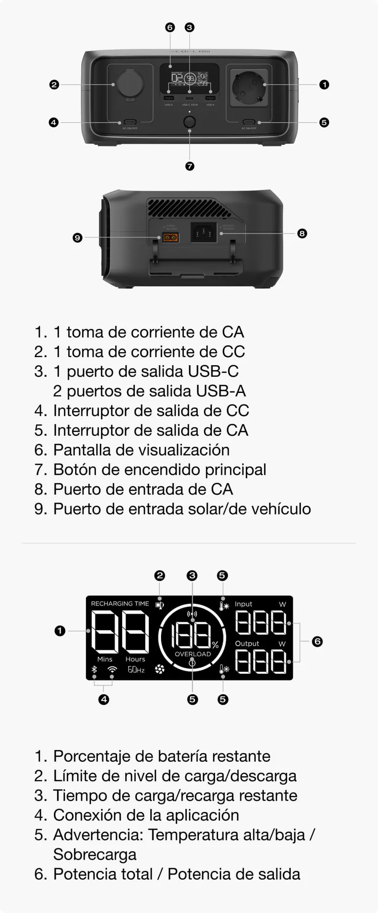 • Múltiples métodos de carga: CA hasta 305 W, solar hasta 110 W y carga desde vehículo.